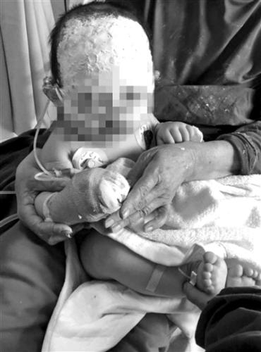 1月26日,還差幾天就滿6個月的航航像往常一樣在家睡午覺。擔心孩子著涼,奶奶在航航床上放了一個取暖器“小太陽”。不久,奶奶因故外出,大概10分鐘后再回來,航航已經(jīng)被嚴重燒傷。不僅整個右手被全部燒焦,臉也被燒得面目全非。
