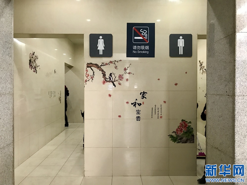 南昌火車站的“廁所革命”,瓷板上都是車站職工創(chuàng)意作品。新華網(wǎng)(楊益民 攝)