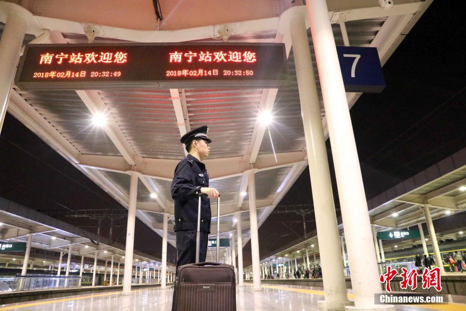孔令揚是南寧鐵路公安處乘警支隊一名普通的乘警,今年28歲,家在山東濟南,父親曾是一名鐵路警察。平時,這名年輕的“90”后鐵警,不停地來往于南寧和濟南之間,與妻子和父母過著聚少離多的“雙城”生活,每月只有6個晚上在家。今年大年三十和初一正好是他值班,大年三十晚上20時40分,孔令揚值乘的G434次高鐵列車才到達濟南西站,孔令揚趕緊趕回家與父母團聚。2月16日(年初一)早上6時,他即從家里出發(fā),趕到濟南西站,值乘上午8時15分由濟南西開往南寧東的G433次列車?琢顡P只能和父母相聚不到8個小時,沒來得及和妻子一起去岳母娘家省親?琢顡P只是南寧鐵路公安處大年夜值乘民警中的一員,今年大年夜和年初一,南寧鐵路公安處共有40多名民警堅守在崗位上。胡宏 攝 -