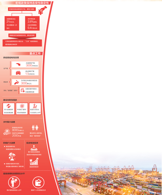 “穩(wěn)”主要體現(xiàn)在:自十八大以來,我國財(cái)政赤字率安排已連續(xù)四年增長且近兩年始終保持在3%的水平。穩(wěn)定赤字預(yù)期,鞏固近年來在管控地方政府債務(wù)方面取得的積極成效,并為未來中央宏觀調(diào)控預(yù)留充裕的財(cái)政空間。“進(jìn)”主要體現(xiàn)在:通過優(yōu)化財(cái)政支出結(jié)構(gòu),更多向創(chuàng)新驅(qū)動(dòng)、“三農(nóng)”、民生等領(lǐng)域傾斜,實(shí)現(xiàn)精準(zhǔn)扶持,主要體現(xiàn)為結(jié)構(gòu)性增支赤字。