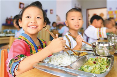 在貴州省黔東南苗族侗族自治州凱里市易地扶貧搬遷后新建的幼兒園內(nèi),孩子們一起吃免費(fèi)“營養(yǎng)午餐”! 羌髷z(新華社發(fā))