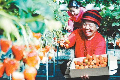 為幫助農(nóng)民增收致富,北京市密云區(qū)積極培育能夠使用“互聯(lián)網(wǎng)+”技術(shù)的新型農(nóng)民,并幫助他們與成熟的電商平臺對接,采取“訂單—備貨—宅配”的模式銷售農(nóng)產(chǎn)品,使得農(nóng)民足不出村就能輕松把農(nóng)產(chǎn)品賣掉,而且價格比市場上高出不少。圖為密云區(qū)十里堡鎮(zhèn)農(nóng)民蒙香梅根據(jù)預(yù)售訂單,采摘在市場上頗受青睞的“紅顏”草莓。