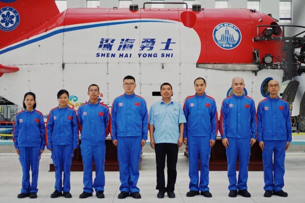 △深海勇士”載人潛水器總設(shè)計(jì)師胡震(右四)與七名潛航員