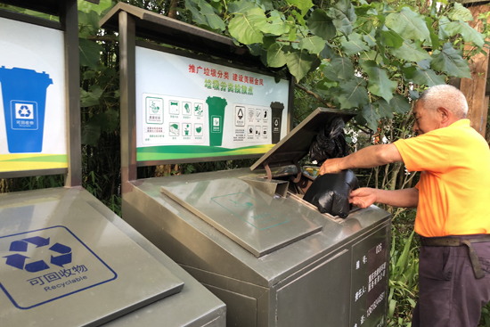 石家槽坊村民將垃圾放入封閉式垃圾箱