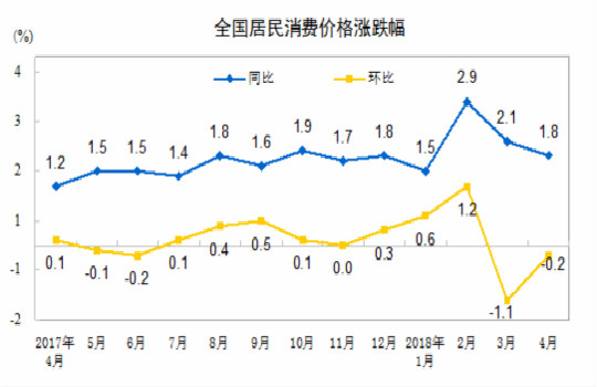 國家統(tǒng)計局?jǐn)?shù)據(jù)顯示,4月份CPI同比上漲1.8%,漲幅較3月小幅回落0.3個百分點,跌回了“1時代”。