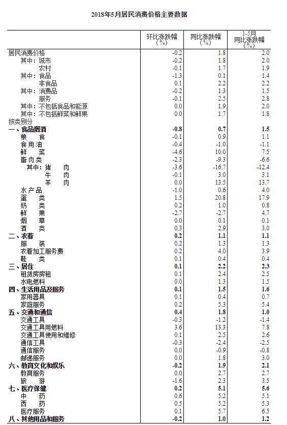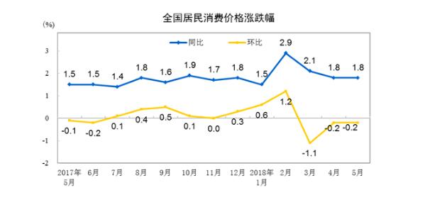 2018年5月份,全國居民消費價格同比上漲1.8%。其中,城市上漲1.8%,農(nóng)村上漲1.7%;食品價格上漲0.1%,非食品價格上漲2.2%;消費品價格上漲1.3%,服務價格上漲2.5%。1-5月平均,全國居民消費價格比去年同期上漲2.0%。