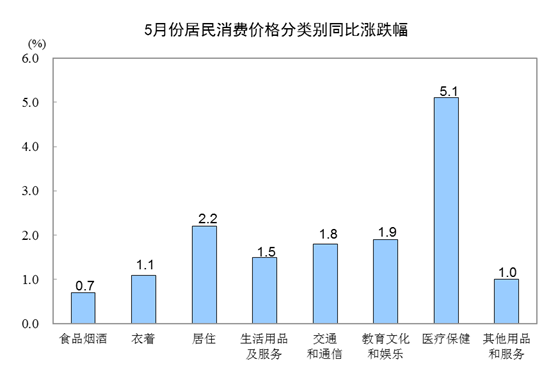 其他七大類價格同比均上漲。其中,醫(yī)療保健、居住、教育文化和娛樂價格分別上漲5.1%、2.2%和1.9%,交通和通信、生活用品及服務價格分別上漲1.8%和1.5%,衣著、其他用品和服務價格分別上漲1.1%和1.0%。