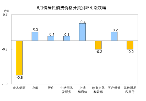 5月份,全國居民消費價格環(huán)比下降0.2%。其中,城市下降0.2%,農(nóng)村下降0.1%;食品價格下降1.3%,非食品價格上漲0.1%;消費品價格下降0.2%,服務價格下降0.1%。