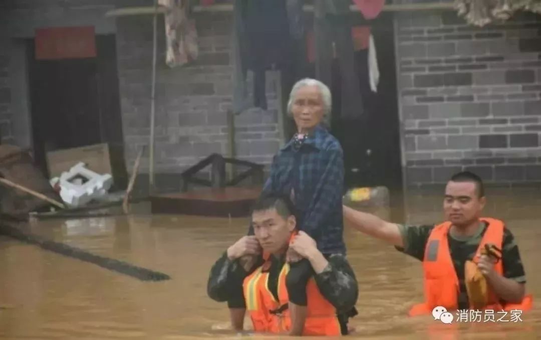 6月8日,受臺(tái)風(fēng)“艾云尼”外圍影響,江西省泰和縣境內(nèi)普降暴雨,造成水位暴漲,這位老人因左腿有疾行動(dòng)不便,沖鋒舟無(wú)法靠近,為了不使她身上被水弄濕,消防戰(zhàn)士讓其騎在肩上,徒步趟過齊胸深的洪水。