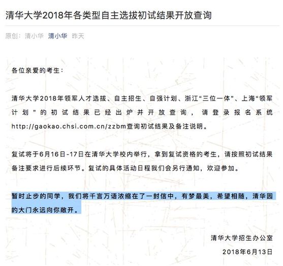 對于“暫時止步的同學”,清華招辦發(fā)出一封信,暖心約定“清華園的大門永遠向你敞開”!