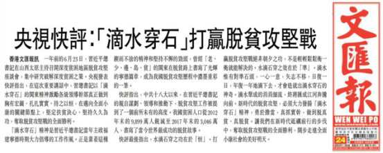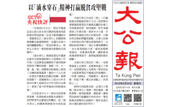 央視網(wǎng)消息:6月24日,香港《文匯報(bào)》和香港《大公報(bào)》同時(shí)轉(zhuǎn)發(fā)了中央廣播電視總臺(tái)央視新聞刊播的《央視快評(píng)》。文章指出,一年前的6月23日,習(xí)近平總書記在山西太原主持召開深度貧困地區(qū)脫貧攻堅(jiān)座談會(huì),集中研究破解深度貧困之策。在這次重要講話中,習(xí)總書記以“滴水穿石”的閩東精神激勵(lì)各級(jí)領(lǐng)導(dǎo)干部真正做到胸有宏圖、扎扎實(shí)實(shí)、持之以恒,在邁向全面小康的關(guān)鍵節(jié)點(diǎn)上,堅(jiān)定扶貧決心、堅(jiān)持久久為功,奪取脫貧攻堅(jiān)戰(zhàn)的全面勝利。報(bào)道內(nèi)容如下: