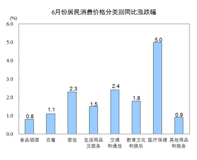 其他七大類價(jià)格同比均上漲。其中,醫(yī)療保健、交通和通信、居住價(jià)格分別上漲5.0%、2.4%和2.3%,教育文化和娛樂(lè)、生活用品及服務(wù)價(jià)格分別上漲1.8%和1.5%,衣著、其他用品和服務(wù)價(jià)格分別上漲1.1%和0.9%。