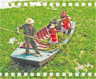 武漢水上管理處清漂隊在長江漢口段打撈水葫蘆。資料圖片