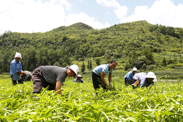 7月11日,在長順縣代化鎮(zhèn)納傍村一塊蔬菜基地上,一群當?shù)卮迕裾χ。來自周邊睦化?0歲的韋小瓊,每天早上六點起床,七點半吃完早餐就來納傍村蔬菜基地務工!暗竭@里來做活,多少得點零用錢,離家近很方便!闭f起在這里務工的好處,韋小瓊樂呵呵的說,“現(xiàn)在比以前好多了,以前又苦又累都沒得一碗好飯吃,來這里打工一天70塊,可以有點小用錢!边@是納傍村脫貧攻堅產(chǎn)業(yè)發(fā)展帶動的一個縮影。