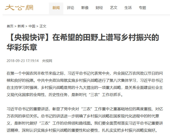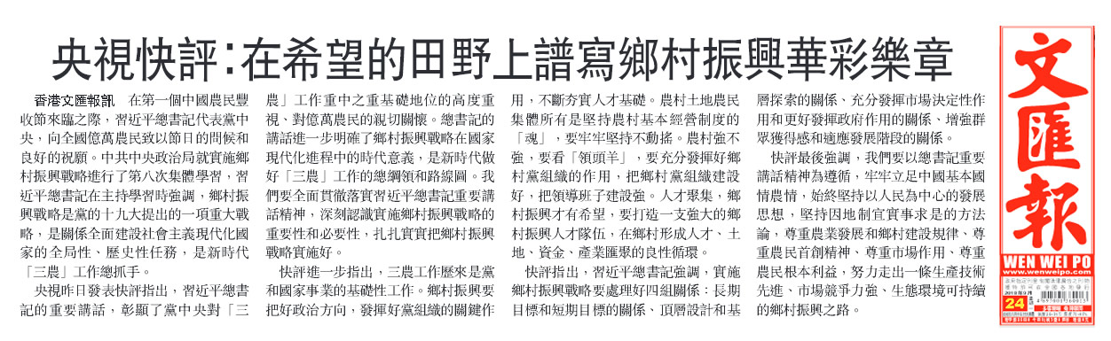 央視網(wǎng)消息:9月23日至24日,香港《文匯報(bào)》和香港《大公報(bào)》網(wǎng)站轉(zhuǎn)發(fā)了中央廣播電視總臺(tái)央視新聞23日刊播的《央視快評(píng):在希望的田野上譜寫(xiě)鄉(xiāng)村振興的華彩樂(lè)章》。報(bào)道內(nèi)容如下: