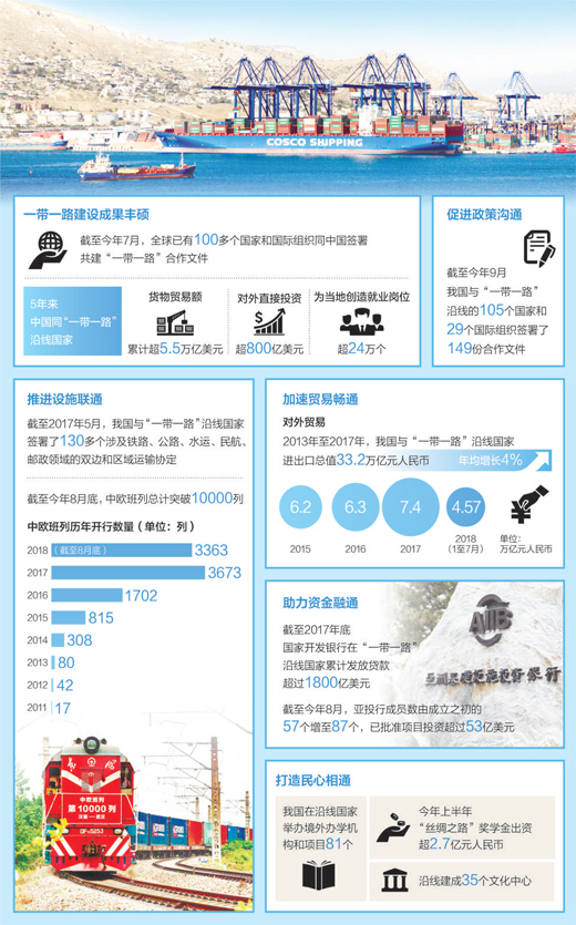 2018年是“一帶一路”倡議提出5周年。2013年,習(xí)近平主席在哈薩克斯坦和印度尼西亞提出共建“一帶一路”倡議,得到積極響應(yīng);截至今年7月,全球已有100多個(gè)國(guó)家和國(guó)際組織同中國(guó)簽署共建“一帶一路”合作文件。