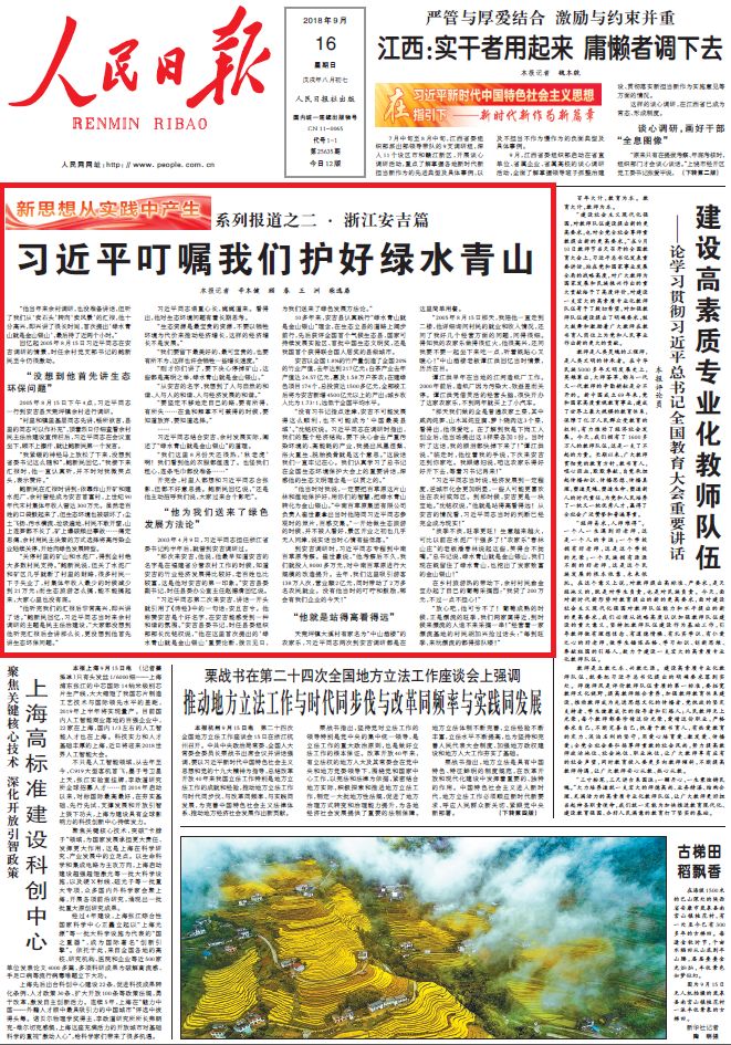 9月16日,專欄第二篇《習(xí)近平叮囑我們護好綠水青山》選在了浙江安吉,習(xí)近平在主政浙江期間,分別于2003年、2005年在此進行調(diào)研,既然欄目是“新思想從實踐中產(chǎn)生”,這一新思想已經(jīng)呼之欲出——“綠水青山就是金山銀山”,這一重要發(fā)展理念,就是習(xí)近平在安吉調(diào)研時首次提出的。人民日報記者采訪了當?shù)氐亩嗝刹咳罕,詳細講述了“兩山論”的起源。