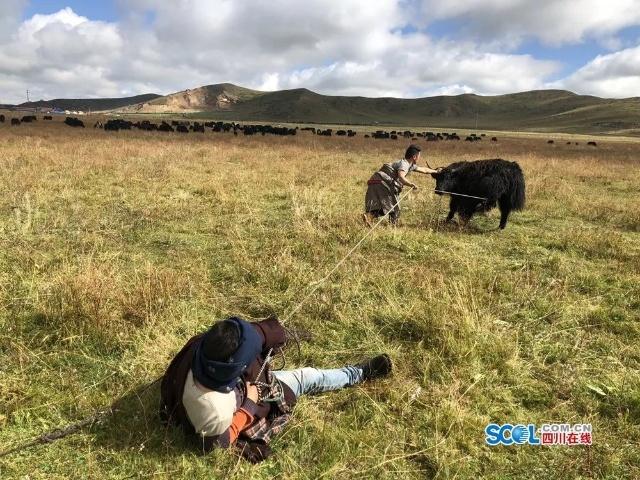 采訪團隊第一次和撲爾洼甲碰面是在若爾蓋縣城外的一片大草原上,當(dāng)時的他恰巧在和牧民一起采取牛絨。在草原上騎著高大的駿馬,疾馳中套住瘋攢的牦牛,然后一個抱摔將一頭重量超過一噸的牦牛撂倒在地,三下五除二就采下了一大捧牛絨。