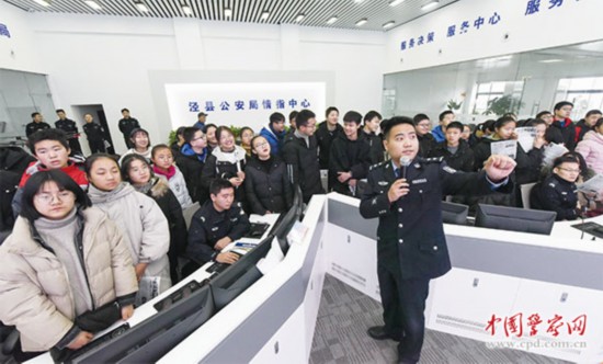 1月9日,安徽省涇縣公安局組織60名初中學(xué)生來到指揮中心,體驗(yàn)110接處警工作。圖為民警向?qū)W生講解110的工作流程。 王響寧 攝
