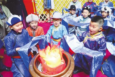 孩子們體驗蒙古族小年祭火儀式。