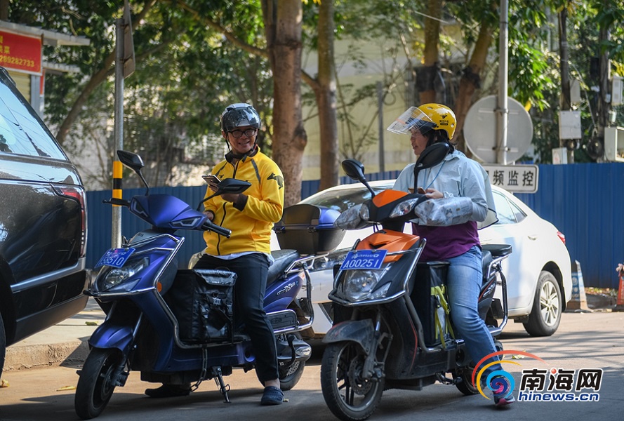 2019年2月8日,?谑旋埲A區(qū)南海大道,兩位快遞員休息空隙中互相打招呼。海報全媒體中心記者 袁琛 攝