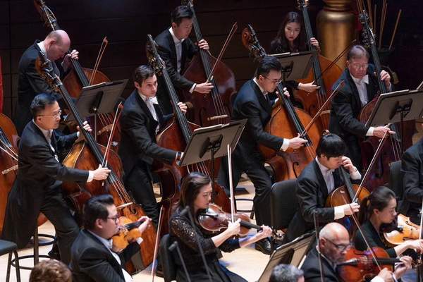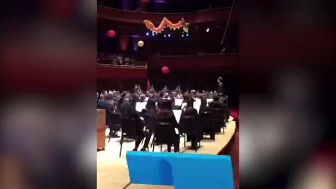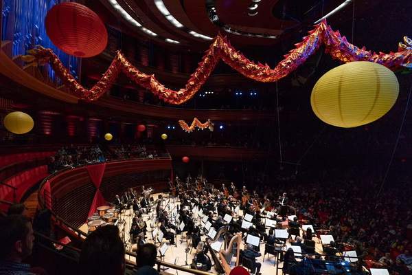 擁有2500個座位的音樂廳上空懸掛著兩條中國龍,費城交響樂團和遠道而來的上海愛樂樂團同臺,聯袂奏響了“費城首屆中國新年音樂會”。