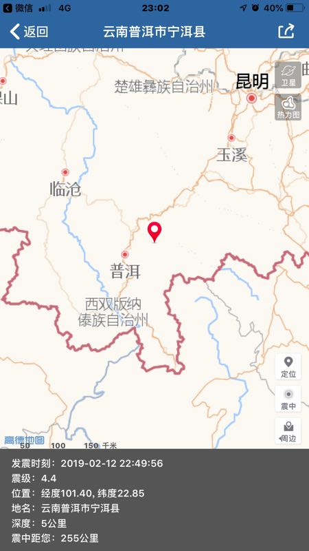 據(jù)中國地震臺網(wǎng)正式測定:2019年02月12日22時49分56秒在云南普洱市寧洱縣(黎明鄉(xiāng))(北緯22.85度、東經(jīng)101.40度)發(fā)生4.4級地震,震源深度5公里。據(jù)了解,震中位于寧洱縣的黎明鄉(xiāng),離縣城有42公里,所以寧洱縣城震感不是很強烈。具體受災(zāi)情況正在進一步核實中。(央視記者 李常明)