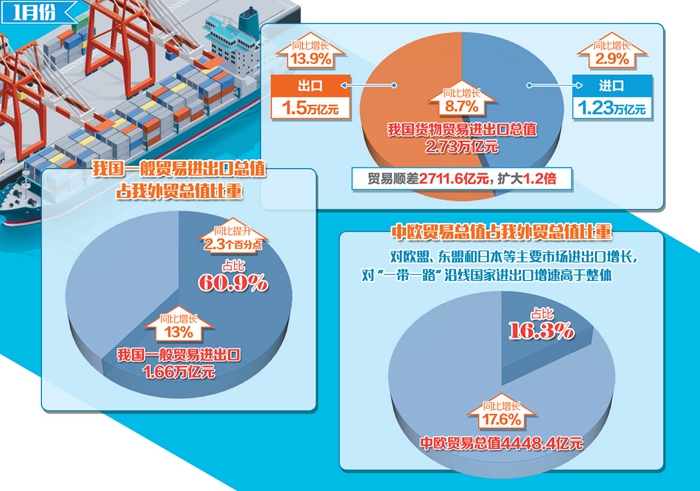 據(jù)統(tǒng)計(jì),1月份中歐貿(mào)易總值4448.4億元,增長17.6%,占我國外貿(mào)總值的16.3%。我國與東盟貿(mào)易總值為3566億元,增長7.8%,其中對(duì)東盟出口增長了17.6%;同期,我國對(duì)“一帶一路”相關(guān)國家合計(jì)進(jìn)出口7708億元,增長11.5%,高出全國整體增速2.8個(gè)百分點(diǎn),外貿(mào)占比接近三成。