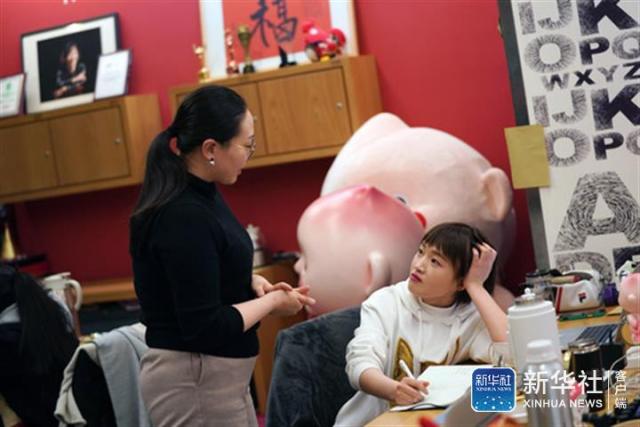 ↑2月21日,張世玉(右)在位于北京光華路SOHO的公司里與同事交流。