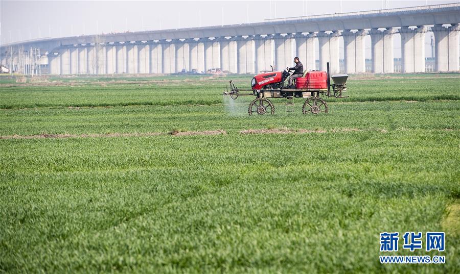 3月16日,在湖北省襄陽(yáng)市襄州區(qū)的10萬(wàn)畝小麥綠色高質(zhì)高效示范區(qū),農(nóng)業(yè)技術(shù)推廣人員進(jìn)行病蟲(chóng)害機(jī)械化綠色綜合防控作業(yè)。新華社記者 肖藝九 攝
