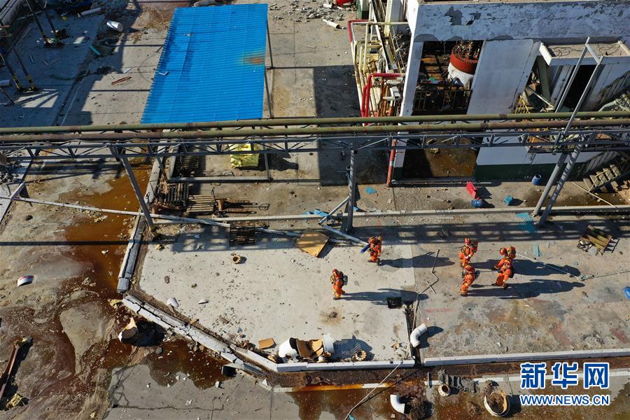 3月22日,消防隊員在江蘇鹽城響水化工廠爆炸事故現場搜救(無人機拍攝)。 新華社記者 季春鵬 攝