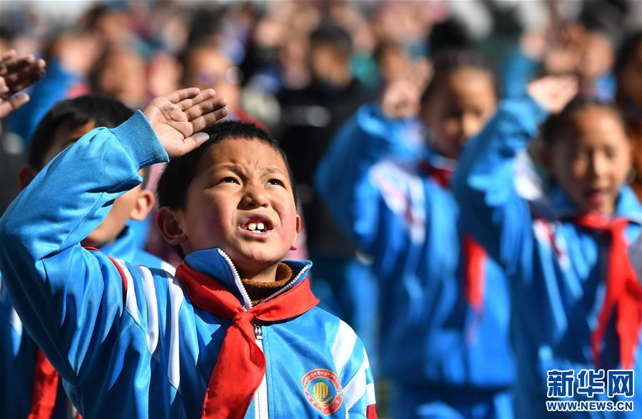 3月4日,在拉薩市第一小學(xué),少先隊員在升國旗儀式上向國旗敬禮。新華社記者 覺果 攝