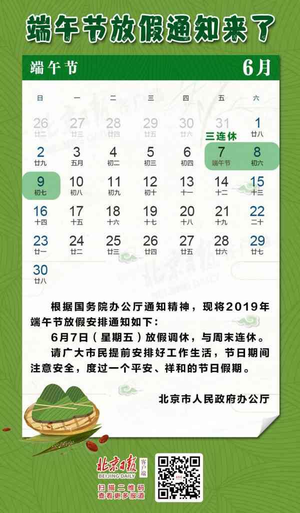 根據(jù)國務(wù)院辦公廳通知精神,現(xiàn)將2019年端午節(jié)放假安排通知如下: