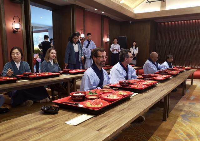 陳福、請(qǐng)?bào)、謝福、敬天地、進(jìn)餐……5月17日中午,在曲阜尼山書院酒店,身著漢服的外國(guó)友人體驗(yàn)了尼山食禮!耙郧笆峭ㄟ^書本了解到儒家文化,這次來(lái)山東,才真正感受到儒家文化的博大精深!边M(jìn)餐時(shí),烏茲別克斯坦記者創(chuàng)作聯(lián)合會(huì)副主席霍穆羅德·薩利莫夫拿出手機(jī)記錄了整個(gè)過程,他要帶去回給家人觀看。稍晚,外國(guó)友人來(lái)到在孔府、孔廟參觀,大家一邊聆聽講解員介紹,一邊拍照留念。