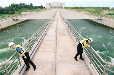 2018年8月14日,南水北調(diào)中線干線滎陽管理處工作人員在南水北調(diào)索河渡槽附近巡查渠道安全。新華社記者 魯 鵬 攝