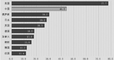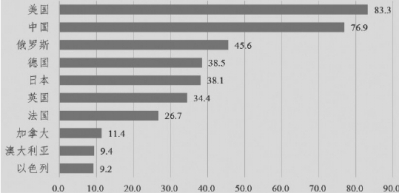 美國(guó)公眾心目中的10個(gè)世界大國(guó)(單位:%)