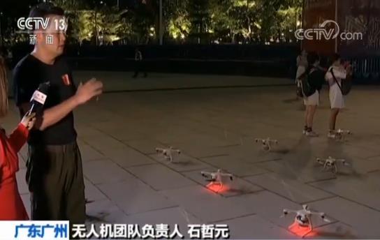 當(dāng)晚,999架無人機(jī)組成的編隊(duì)與“小蠻腰”及周邊樓體燈光秀配合,共同點(diǎn)亮花城夜空。無人機(jī)編隊(duì)變換出五星紅旗、港珠澳大橋、“我愛你中國”等不同圖案和文字。除了燈光秀,廣州塔塔身還顯示出“1949-2019”、“我們都是護(hù)旗手”、“我和國旗同框”等文字,配合無人機(jī)編隊(duì)表演,F(xiàn)場觀眾紛紛舉起手機(jī),拍攝照片和視頻,留下這難忘的一幕。