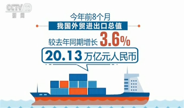 海關(guān)統(tǒng)計顯示,今年前8個月,我國外貿(mào)進(jìn)出口總值20.13萬億元人民幣,較去年同期增長3.6%,其中出口10.95萬億元,同比增長6.1%,進(jìn)口9.18萬億元,同比增長0.8%。
