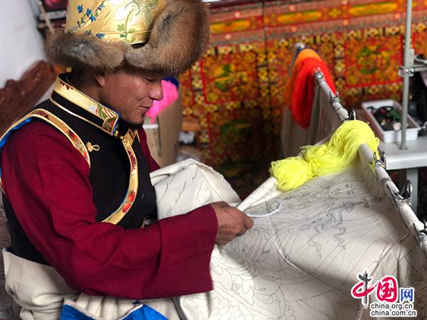 平措次仁在繡唐卡。受訪者供圖