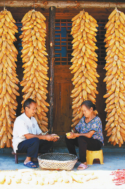 9月13日,貴州省銅仁市印江土家族苗族自治縣新寨鎮(zhèn)泗塘村農(nóng)民正在給豐收的玉米脫粒。 左禹華攝(影像中國)