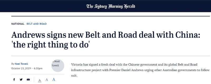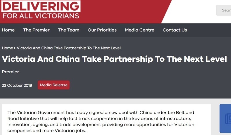 維多利亞州政府的官方聲明顯示,安德魯斯州長與中國國家發(fā)展和改革委員會簽署了框架協(xié)議,這是維多利亞州與中國關(guān)系密切的另一個跡象。此前,雙方于2018年簽署了“一帶一路”諒解備忘錄。