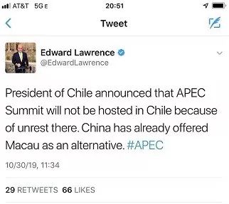 。ㄖ抢偨y(tǒng)宣布因?yàn)轵}亂不在智利舉辦APEC峰會,中國提議澳門作為備選)“中國提議到澳門去簽協(xié)議”,是真是假?