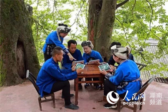 湘西電大副校長龍曉穎(左二)指導(dǎo)農(nóng)民大學(xué)生利用學(xué)習(xí)PAD進(jìn)行小組學(xué)習(xí)。湖南廣播電視大學(xué)供圖