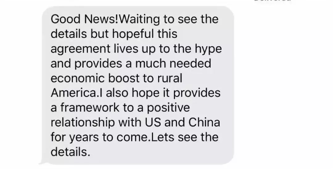 就在中美雙方就第一階段協(xié)議文本達(dá)成一致的消息發(fā)布后不久,中央廣播電視總臺(tái)駐華盛頓記者劉驍騫的手機(jī)上,就收到了美國(guó)農(nóng)場(chǎng)主布萊恩·杜坎的信息。