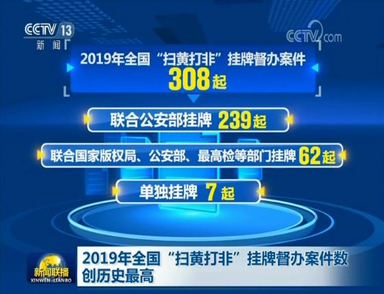 央視網(wǎng)消息(新聞聯(lián)播):全國“掃黃打非”辦公室今天(12月25日)對外通報(bào),2019年掛牌督辦“掃黃打非”案件數(shù)量創(chuàng)歷史最高,全年共掛牌督辦大案要案308起。其中,聯(lián)合公安部掛牌239起,聯(lián)合國家版權(quán)局、公安部、最高檢等部門掛牌62起,單獨(dú)掛牌7起。