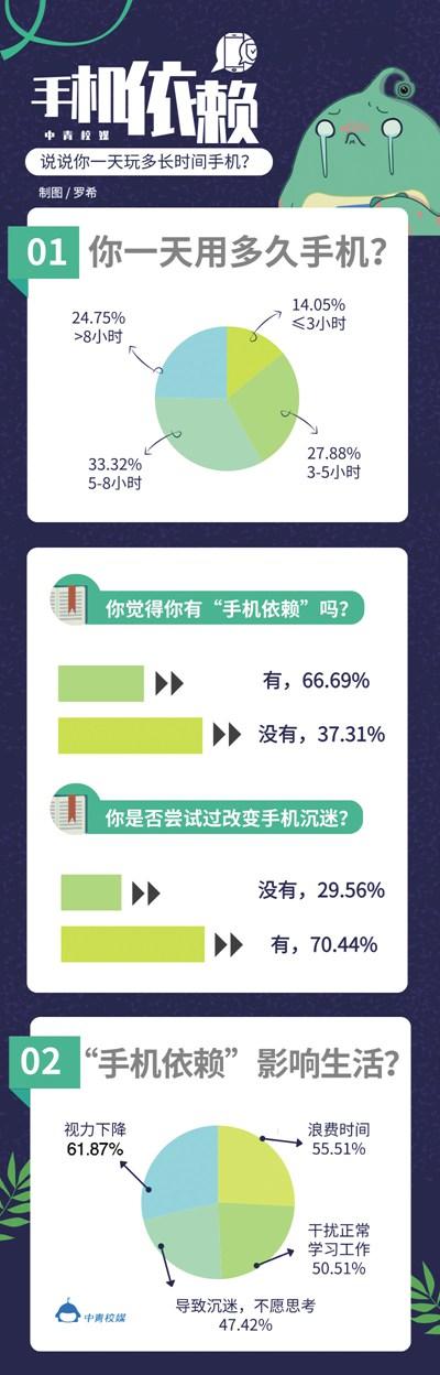 中青校媒調(diào)查顯示,62.69%被調(diào)查者認為自己過度依賴手機。被調(diào)查者中,80.75%的人認為,長時間使用手機是浪費時間,最好可以適度使用。