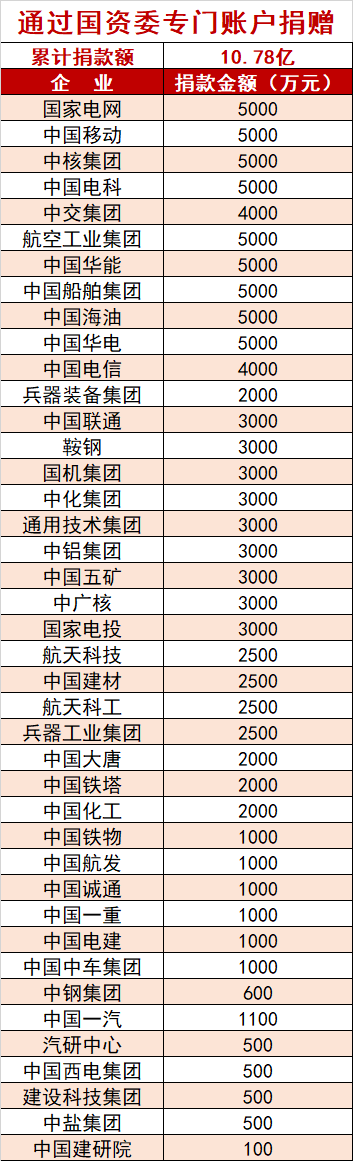 據(jù)初步統(tǒng)計,截至1月30日15時,目前共有41家中央企業(yè)通過國務(wù)院國資委專用賬戶向湖北疫情防控一線捐款10.78億元。在國家電網(wǎng)、航天科技(11.770, 0.02, 0.17%)、中國航發(fā)、中國誠通、鞍鋼集團(tuán)、中國移動、中國大唐等7家央企前期通過國務(wù)院國資委專用賬戶向湖北疫情防控一線首批捐款1.95億元的基礎(chǔ)上,這兩天陸續(xù)又有中核集團(tuán)、航空工業(yè)、中國電信、中國聯(lián)通(5.650, -0.23, -3.91%)、國家電投、國機(jī)集團(tuán)、中國建材、中國鐵塔、中鋁集團(tuán)、中國通用技術(shù)集團(tuán)、中化集團(tuán)、兵器裝備集團(tuán)、兵器工業(yè)集團(tuán)、中國電子科技集團(tuán)、中國汽車技術(shù)研究中心、中國交建(8.400, -0.28, -3.23%)、中國西電(3.520, -0.12, -3.30%)等央企通過國務(wù)院國資委專用賬戶捐款8.83億元。