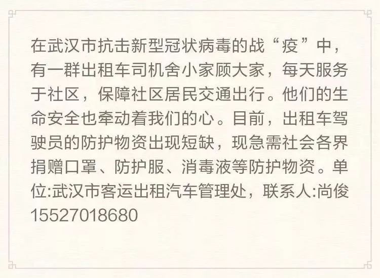 疫情就是命令,防控就是責(zé)任。武漢的抗疫進(jìn)展?fàn)縿?dòng)著陜西省西安市出租汽車集團(tuán)(以下簡(jiǎn)稱“西汽集團(tuán)”)全體員工的心。1月29日,一封來自武漢大通出租公司的求助信息引起了西汽集團(tuán)高度關(guān)注,信息中提到武漢出租行業(yè)出現(xiàn)防護(hù)物資短缺,急需支援。西汽集團(tuán)得知消息后,立即召開專題會(huì)議,作出特別批示:“'一方有難、八方支援',西汽集團(tuán)要克服一切困難籌集調(diào)度物資,千里馳援武漢兄弟單位,保障為城市作貢獻(xiàn)的出租汽車駕駛員生命安全”!