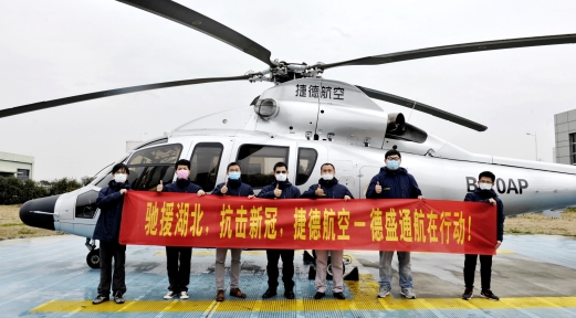 2月5日上午,捷德航空全資子公司德盛通航一架滿載醫(yī)用物資的空客H155直升機(jī)由浙江起飛,將防控一線緊缺的醫(yī)用物資定向投送至湖北黃岡、武漢和孝感三地。