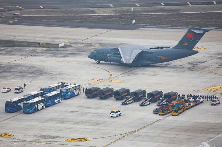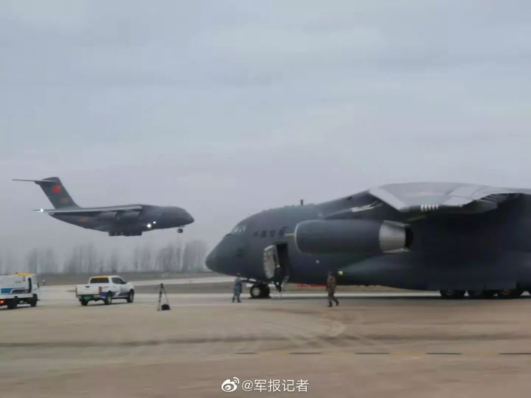 2月13日凌晨,空軍出動包括中國自主研制的6架運20在內(nèi)的3型11架運輸機,分別從烏魯木齊、沈陽、西寧、天津、張家口、成都、重慶等7地機場起飛,向武漢空運軍隊支援湖北醫(yī)療隊隊員和物資。上午9時30分許,11架運輸機全部抵達武漢天河機場。